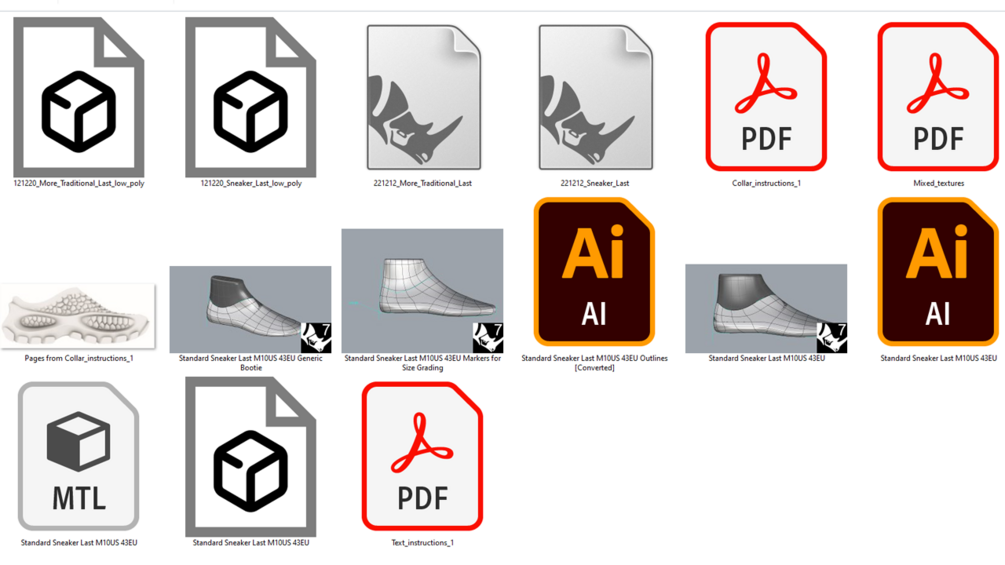 Files of lasts and guides for manufacturing footwear. Include Rhino, Illustrator and Obj files.